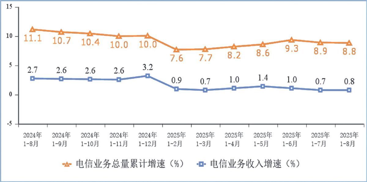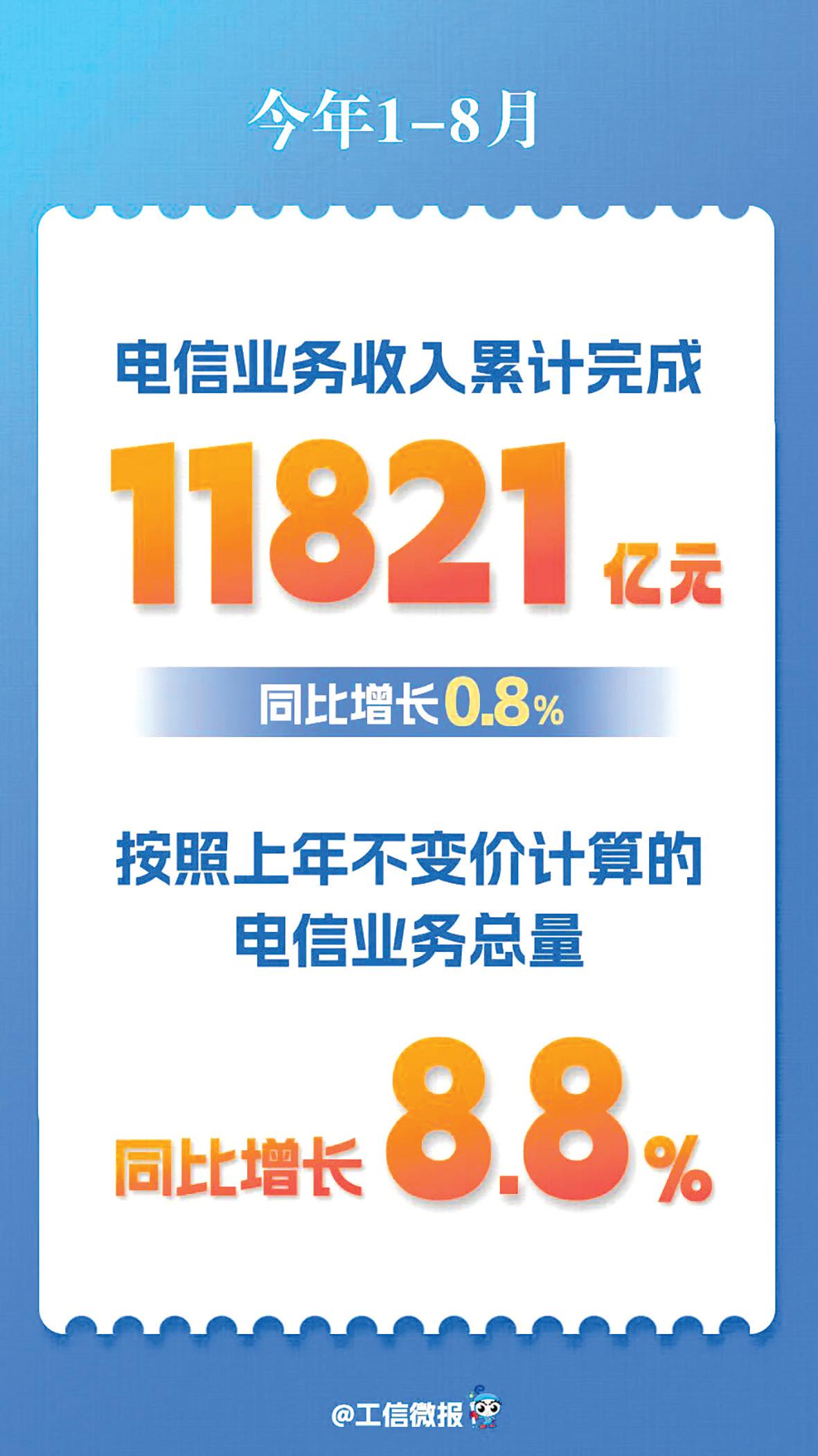 电信营业收入连结正增加,电信营业总量较快增加。前8个月,电信营业收入累计完成11821亿元,同比增加0.8%。根据上年稳定价计较的电信营业总量同比增加8.8%。