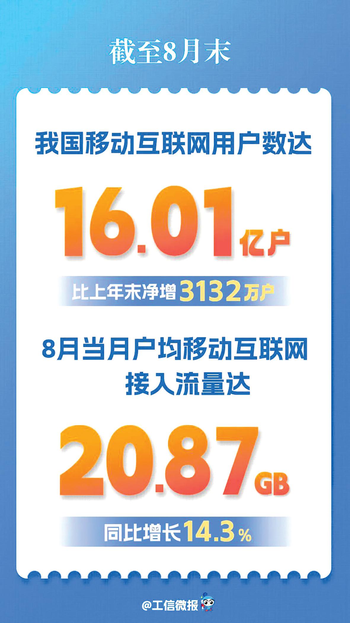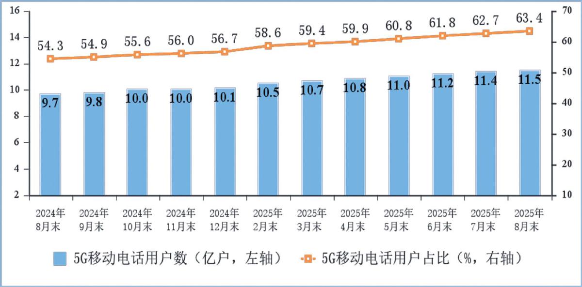 挪动德律风用户稳中有增,5G用户范围连续扩展。截至8月末,三家基础电信企业和中国广电的挪动德律风用户总数达18.19亿户,比上年底净增2953万户。此中,5G挪动德律风用户达11.54亿户,比上年底净增1.4亿户,占挪动德律风用户总数的63.4%。