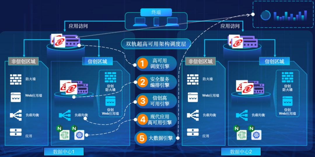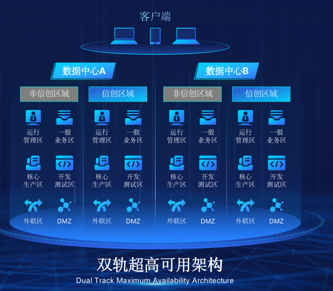 BG集团官网在企业面临自主创新IT基础重构过程中,推出的全新架构双轨超高可用架构(简称DTMAA),在双活数据中心的分区调度基础上,添加每个数据中心内信创域和非信创域的分域调度,来实现分区分域协同的多活双轨超高可用。